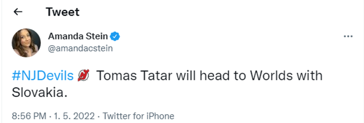 Slovenská hokejová reprezentácia môže na Majstrovstvá sveta v hokeji vo Fínsku rátať s ďalšou posilou. A tentokrát rovno zo zámoria. V slovenskom drese sa predstaví Tomáš Tatar. Jeho New Jersey Devils nepostúpilo do bojov o Stanleyho pohár. S touto skvelou informáciou prišla reportérka samotného klubu zo zámoria, Amanda Stein, na sociálnej sieti Twitter.
